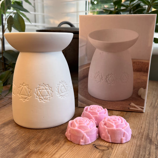 White ceramic oil burner accented with the seven signs of the Chakra