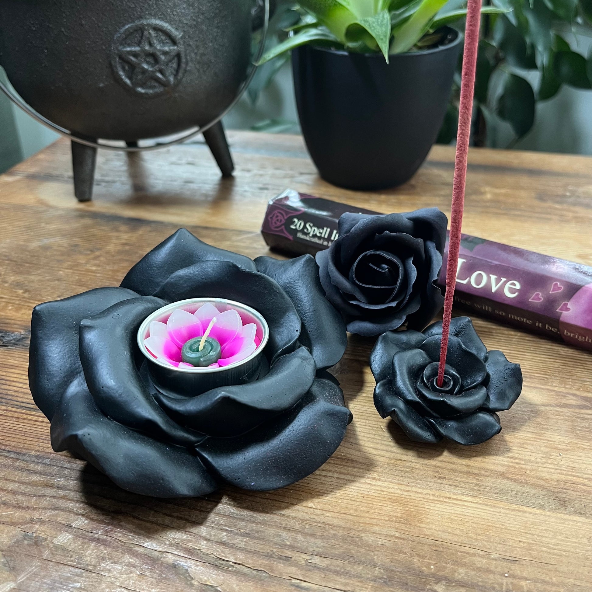 Light the tealight candle and incense to set a sacred, intimate atmosphere. Gently pull one or more petals from the black rose soap flower and add them to a warm bath. As the petals dissolve, focus on love — for a partner, a connection, or yourself and set an intention for deepening trust, passion, or devotion.